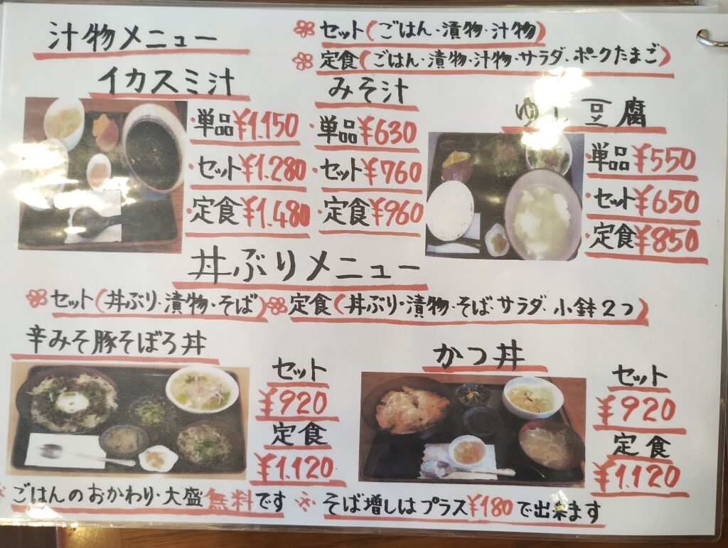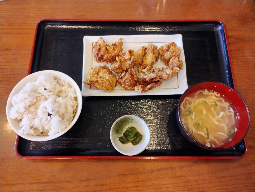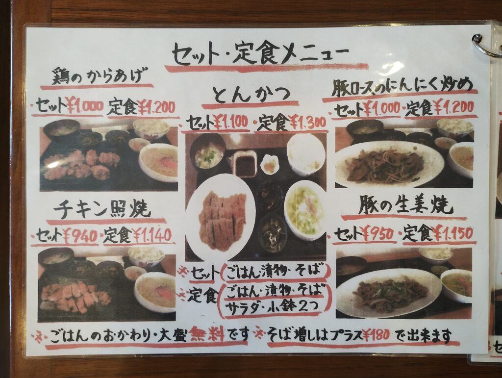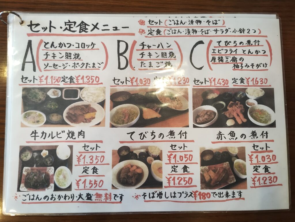 メニューを開くと、その種類の多さに絶望します(良い意味で)。 優柔不断な私は3年くらい悩みましたが、今回は王道の「鶏のからあげセット」をチョイス。 ここで重要な「ひろし攻略法」を伝授します。 メニューには「セット」と「定食」があります。違いは、サラダと小鉢2つが付くかどうか。 迷わず「セット」を選んでください。なぜなら、我々は野菜も摂取して健康になったつもりになりたいからです。