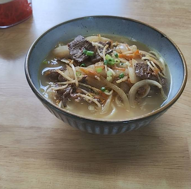 まず「牛肉そば」ですが、これがもう、沖縄そば界のカーニバル! ベースは沖縄そばなんですが、上に乗っているのは「牛肉の野菜チャンプルー」。牛肉の旨味がたっぷり溶け出したスープは、一口飲むと脳内でサンバのリズムが刻まれるほどの美味しさ。野菜のシャキシャキ感と麺のモチモチ感が、口の中で奇跡のコラボレーションを果たします。ダシが最高すぎて、水筒に入れて持ち歩きたいレベルです。