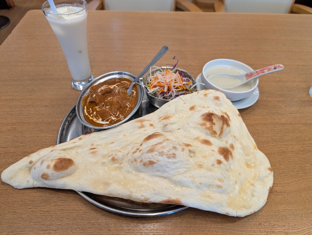 皿からはみ出しまくっている。私の顔の3倍はある。もし私が小顔自慢のモデルだったら、このナンの横で写真を撮って「小顔効果えぐい〜♡」とか投稿してるレベルです。