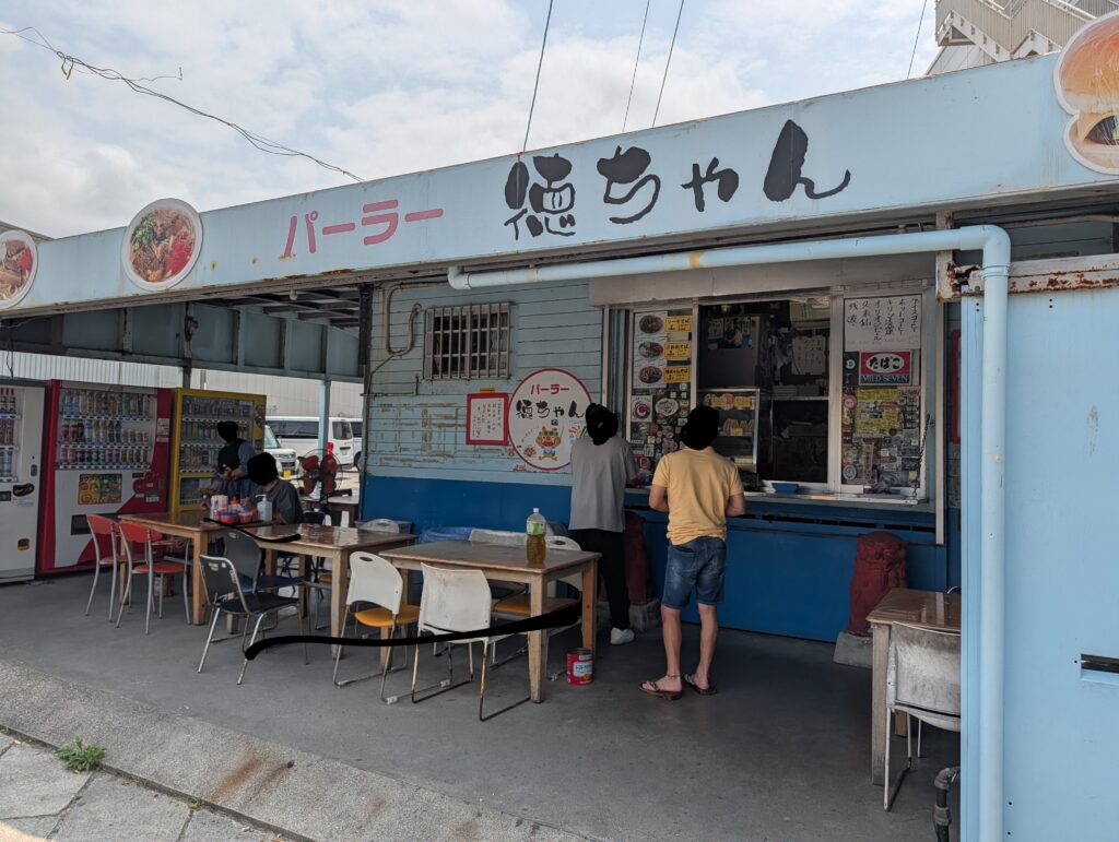 ​そして、この店の醍醐味はなんといっても「席」です。店舗横の簡易テーブル、いわゆるテラス席(という名の屋外)で食べるのが徳ちゃんスタイル。冷房?ありません。扇風機?風次第です。真夏はそりゃあ暑いですよ。額から汗が滴り、スープを飲んでいるのか自分の汗を飲んでいるのか分からなくなる……これぞ沖縄の夏!この熱気、この雑多な空気感こそが、最高のスパイスになるんです。