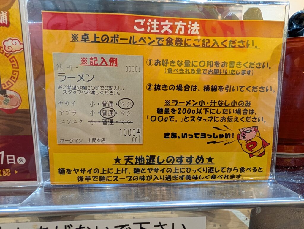 ここの最大の特徴は、「コールの筆記試験化」です。 食券を買ったら、紙に赤ペンで「ヤサイ・アブラ・ニンニク」の量(小・普通・マシ)に丸をつけるだけ。 店員さんと目を合わせず、震える声で呪文を唱える必要はありません。コミュ障の私には涙が出るほど優しいシステム!
