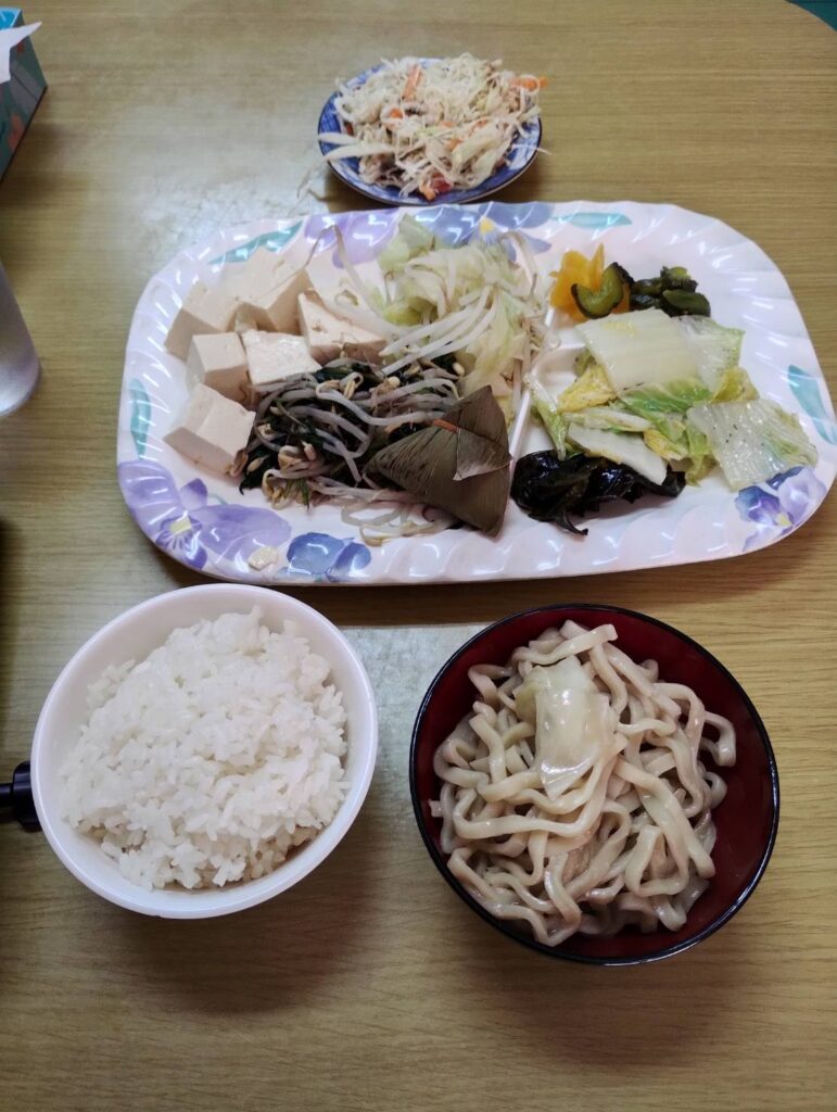 白菜の煮物、キクラゲ炒め、キャベツ、豆腐……優しい、優しすぎる!昨日ステーキと泡盛で荒らされた私の内臓が「ありがとう……ありがとう……」と涙を流して喜んでいます。野菜中心なのに、しっかりした味付けでお粥が進む進む。