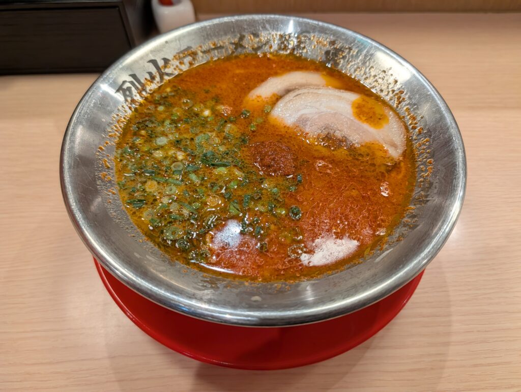着丼したラーメンは、スープが赤を通り越して「マグマ色」。