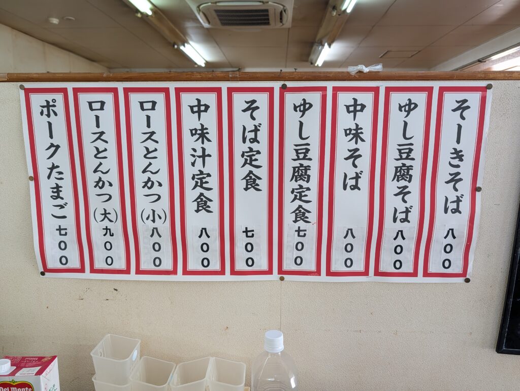 店内に入ると、そこには沖縄の古き良き時間がそのまま真空パックされたような空間が広がっています。売店が併設されているというカオスな光景も、沖縄ローカルの醍醐味。ここでのお作法はただ一つ。「席に座る前に、厨房のおばちゃんに注文を叫ぶこと」。そしてセルフでお茶を汲み、静かに戦いの時を待つのです。