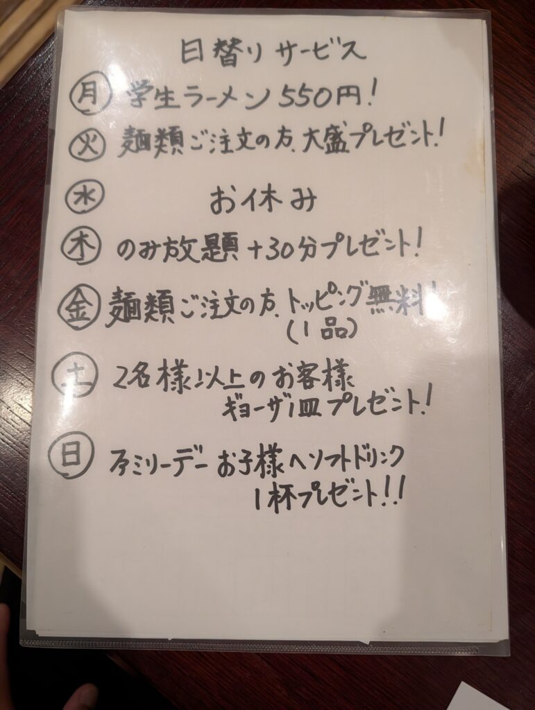 まず特筆すべきは、「曜日替わりのお得なサービス」! 「今日は何がお得なのかな?」と暖簾をくぐるワクワク感、分かりますか? これ、毎日通わせようとする店長の高度な心理戦ですよね。ええ、私は見事にその術中にハマっています。